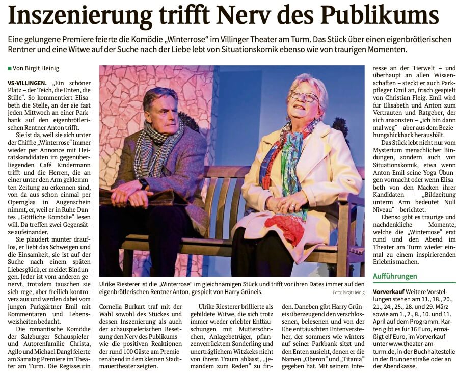 "Eine gelungene Premiere feierte die Komödie „Winterrose“ im Villinger Theater am Turm. Das Stück über einen eigenbrötlerischen Rentner und eine Witwe auf der Suche nach der Liebe lebt von Situationskomik ebenso wie von traurigen Momenten."
