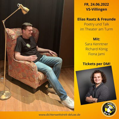 Moderator und Gastgeber Elias Raatz lädt zu einer besonderen Show: in gemütlicher Atmosphäre trifft er sich im Theater am Turm mit seinen Lieblings-Künstlern und befreundeten Slam Poeten. Erleben Sie eine unterhaltsame Show mit klassischem Poetry Slam, garniert von spannenden Interviews und lustigen Publikumsfragen.