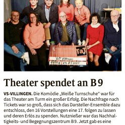 Die Komödie „Weiße Turnschuhe“ war uns ein großer Erfolg. Wegen der großen Nachfrage entschloss sich das Ensemble eine Benefitz-Vorstellung zugunsten des Nachhaltigkeits- und Begegnungszentrum B 9 anzuhängen. Der Scheck über 1111 Euro wurde jetzt an das Team von B9 übergeben.