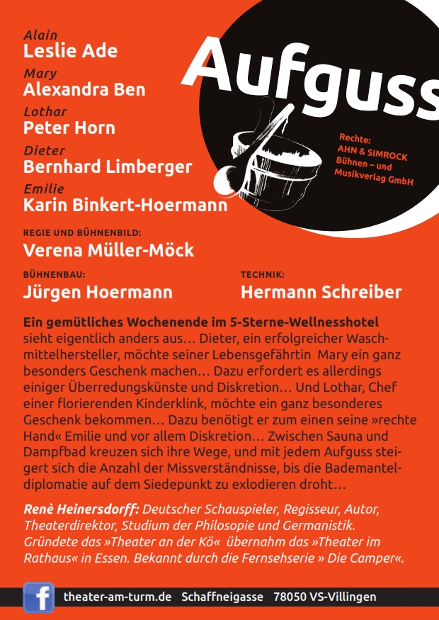 Am 8. November feiert die nächste Eigenproduktion des Theaters am Turm (TaT) Premiere. Um 20 Uhr hebt sich an der Stadtmauer neben dem Kaiserturm der Vorhang für die Boulevardkomödie „Aufguss“ unter der Regie von Verena Müller-Möck.