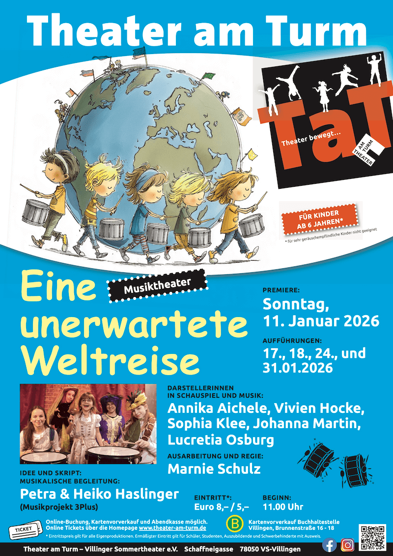 Sie „trommelt“ ihre Freunde zusammen um ihre neuste Entdeckung zu zeigen. Und schon beginnt die Reise. „Eine unerwartete Weltreise“ führt Kinder ab sechs Jahren durch kleine Szenen und musikalische Akzente um die Welt.