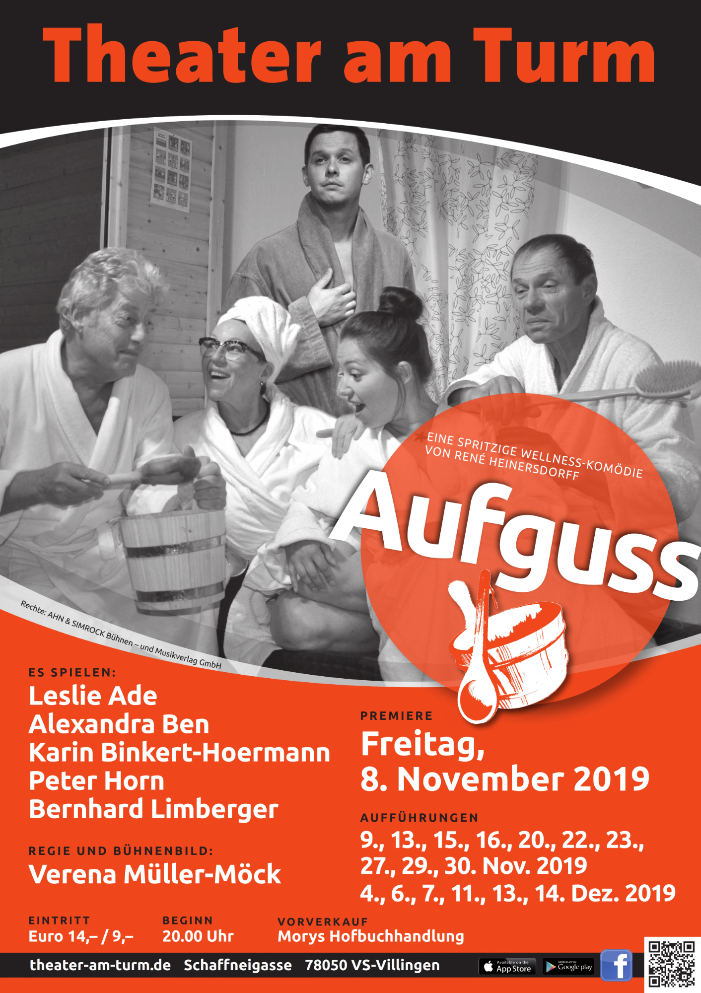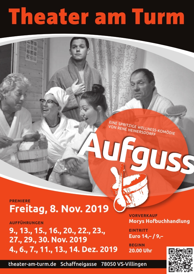 Am 8.11. feierte die neue Eigenproduktion "Aufguss" Premiere im Theater am Turm. Viel Heiterkeit während des Stückes und tosender Applaus am Ende waren der Lohn für die Darbietung des Ensembles und die Vorbereitungen des gesamten Teams.