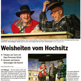 "Weisheiten vom Hochsitz" überschreibt Rüdiger Fein seinen Artikel über die Premiere des Stückes "Waidmannsheil" mit dem die Theatersaison 2019-2020 am 13.9.2019 eröffnet wurde. Unter den Augen der Autorin konnten die beiden Schauspieler Harry Grüneis und Rupert Kubon in der Inszenierung von Lilliana Valla überzeugen.