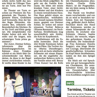 "... Mit viel Witz, Mimik, leidenschaftlicher Spielfreude hatten sie die Lacher im Publikum auf ihrer Seite, dass sie auch noch eine Aufführung mit sehr viel Text problemlos ohne Versprecher stemmten, machte dieses Dinner sehens- und hörenswert..." schreibt Hella Schimkat im Schwarzwälder Boten vom 14.11.