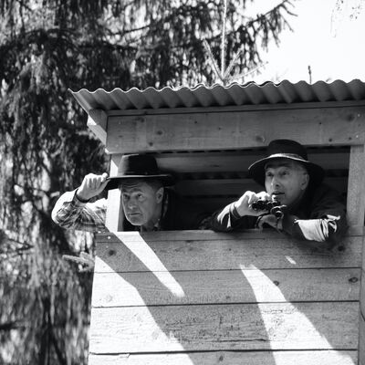die Rehe äsen auf einer Lichtung. In einem Hochsitz am Waldrand lauern zwei Männer auf Beute, doch keine Sau kommt vorbei. Wie heißt es so schön beim Heiligen Hubertus: Vor dem Abschwarten heißt es abwarten.