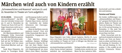 Das Märchen »Schneeweißchen und Rosenrot« der Gebrüder Grimm wird von Kindern im Alter von 8 und 11 Jahren und der Märchenerzählerin Ulrike Dworschak aufgeführt.